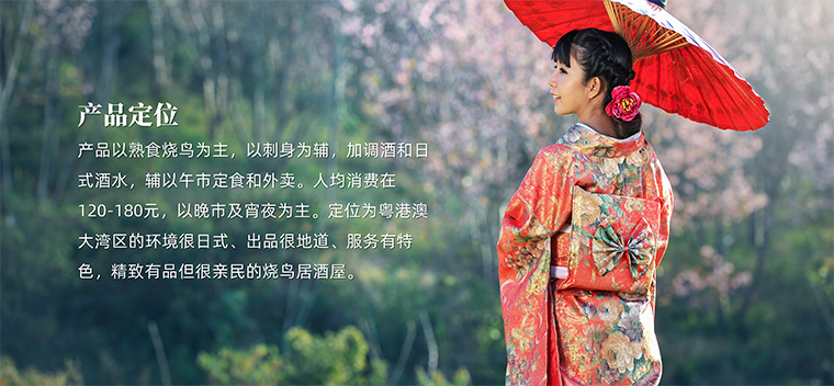 人均消費(fèi)在120-180元,以晚市及宵夜為主。定位為粵港澳大灣區(qū)的環(huán)境很日式、出品很地道、服務(wù)有特色,精致有品但很親民的燒鳥居酒屋。