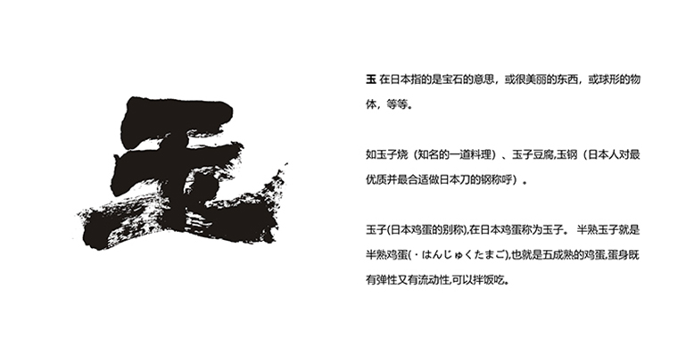 “玉”在日本指的是寶石的意思,或很美麗的東西,或球形的物體等等。如玉子(日本雞蛋的別稱),半熟玉子就是半熟雞蛋(はんじゅくたまご),也就是五成熟的雞蛋,蛋身既有彈性又有流動(dòng)性,可以拌飯吃。玉子燒(知名的一道料理),玉子豆腐,玉鋼(日本人對(duì)最優(yōu)質(zhì)并最合適做日本刀的鋼的美稱)。
