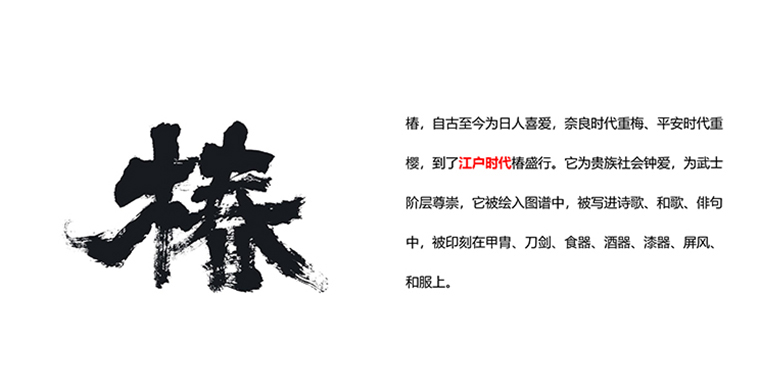 “椿花”是日本對(duì)山茶花的稱呼,花期一般是在冬至春季。椿花的花色秀麗脫俗,香氣清新怡人,人聞到后有精神爽朗的感覺。在日本,椿花與櫻花齊名,被譽(yù)為“圣花”。奈良時(shí)代重梅、平安時(shí)代重櫻,到了江戶時(shí)代椿盛行。“椿”為貴族社會(huì)鐘愛,為武士階層尊崇,它被繪入圖譜中,被寫進(jìn)詩(shī)歌、和歌、俳句中,被印刻在甲胄、刀劍、食器、酒器、漆器、屏風(fēng)、和服上。