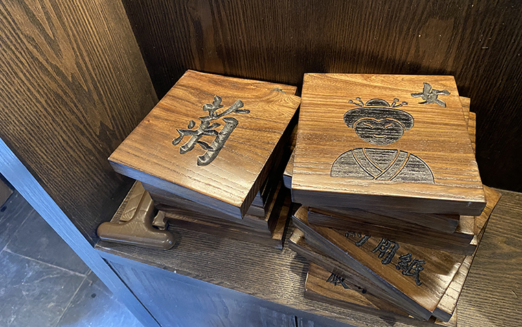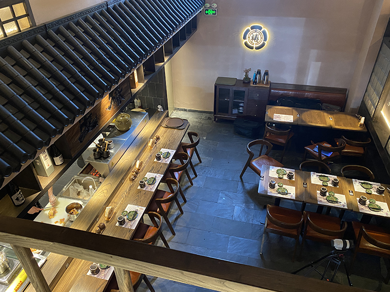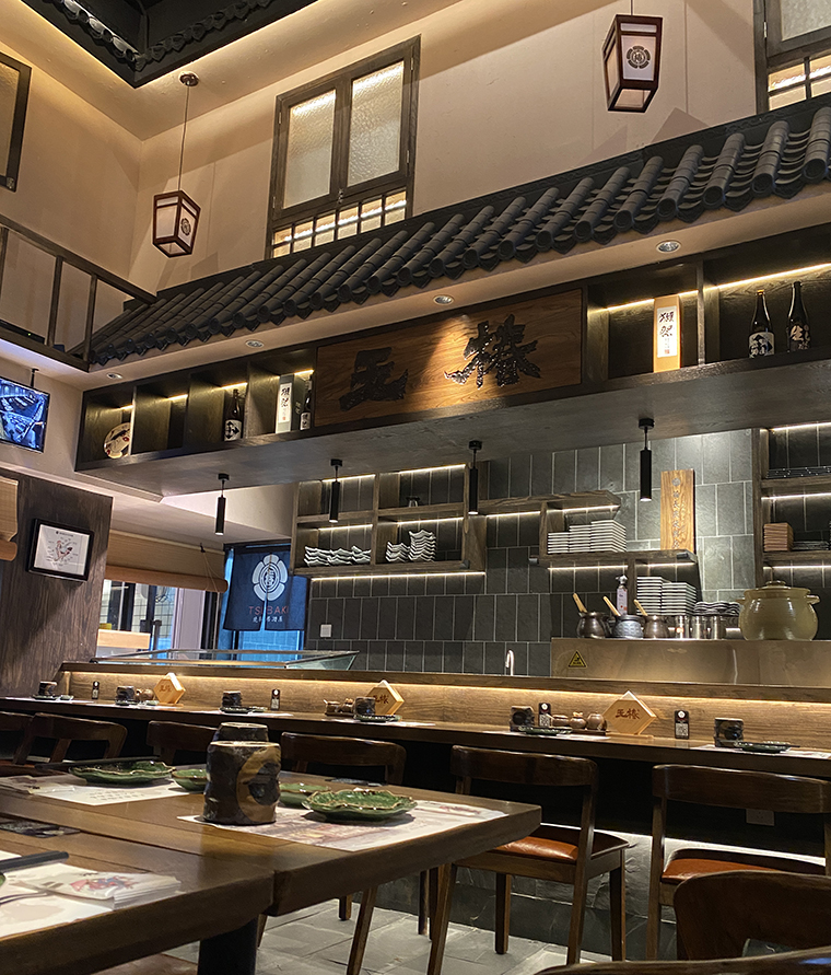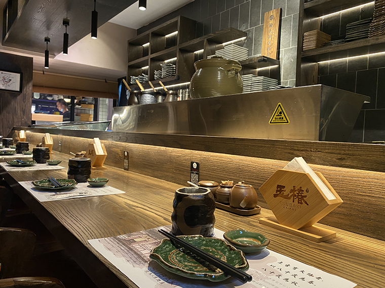 為了營(yíng)造京都風(fēng)格的空間感受,品深餐飲為玉椿設(shè)計(jì)定制的家具采用了實(shí)木材質(zhì),開放漆做舊工藝處理,呈現(xiàn)出一種江戶時(shí)代的歷史滄桑質(zhì)感;與門店的招牌匾額,儲(chǔ)存柜顏色完全一致,顧客使用時(shí)候的歷史