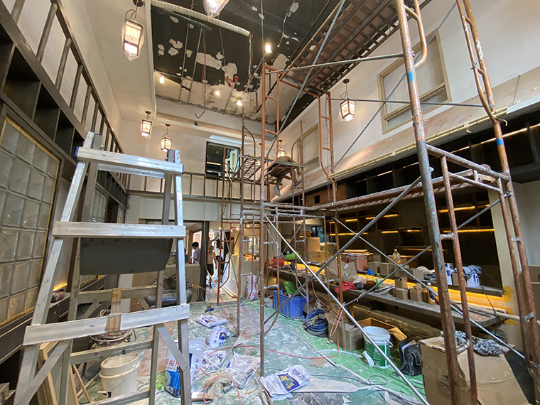 玉椿燒鳥居酒屋首店位于深圳的餐飲網(wǎng)紅高地——車公廟十畝地正對(duì)面。門店之前是一家中餐的后廚的全部空間及部分包間,其中一半的面積屬于上一家餐廳自己搭建的二層。空間結(jié)構(gòu)非常復(fù)雜,地面高地不平,尤其是搭建部分的1層,2層實(shí)際高度不到2.5米,心理感受很逼窄,這個(gè)場(chǎng)地極為