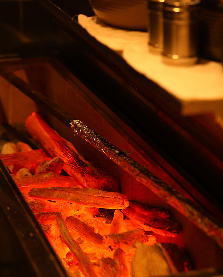 略顯厚重的筆劃,墨色飽滿,濃枯結(jié)合,類似燒鳥用的備長(zhǎng)炭,暗合了我們的品類屬性。