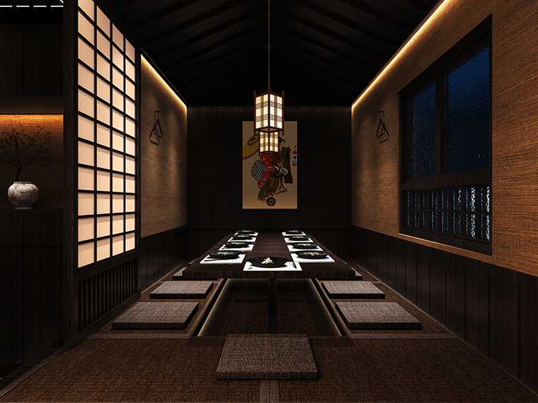 1樓是熱鬧區(qū),二樓則是私密區(qū),安靜區(qū),6個(gè)包間,其中3個(gè)包間設(shè)置為榻榻米結(jié)構(gòu),滿足一部分顧客對(duì)日本料理飲食文化的追求,另外3個(gè)包間則使用了中式座椅,畢竟我們服務(wù)的絕大部分客人是中國(guó)人,