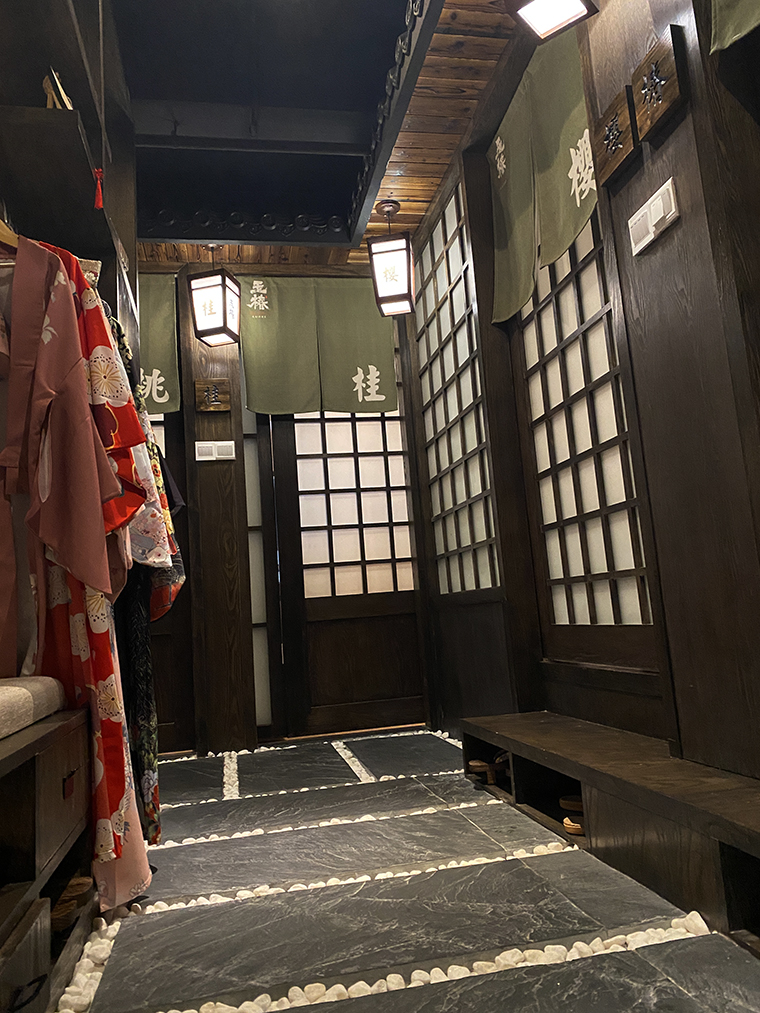 二樓除了必備的洗手間、儲(chǔ)物柜外,還設(shè)置了和服展示區(qū),這是餐飲娛樂化的一大重要趨勢(shì)。
