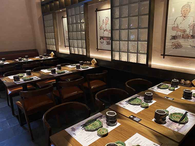 在本項(xiàng)目中,我們?cè)陬櫩瓦M(jìn)餐廳大門的右手邊設(shè)置了水吧,收銀臺(tái)。居酒屋的酒水尤其是生啤非常好銷,水吧具備酒水制作的操作功能、收納功能及門口忙碌時(shí)的接待功能。功能如此繁多,品深餐飲的空間設(shè)計(jì)師需要把每個(gè)設(shè)備的尺寸都考慮到,尺寸偏差不能超過2厘米。收銀臺(tái)的功能反而要弱化,因?yàn)榱餍袙叽a點(diǎn)餐,即時(shí)結(jié)算,顧客不再簇?fù)淼绞浙y臺(tái)來結(jié)賬了。