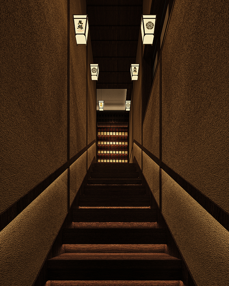 2、一樓大廳及吊頂?shù)脑O(shè)計(jì):把京都的古老街道,巷子搬到我們店里。整個(gè)大廳的頂部環(huán)繞一圈日式黑瓦頂,四周幾個(gè)日式玻璃木窗,與地面的青石瓦面,墻體的稻草漆,燒烤吧臺(tái)形成一體化的京都風(fēng)格。置身其中,仿佛漫步于京都的古老美食街道中,熙熙攘攘,熱鬧非凡,抬頭間還能看見二樓的日本侍女正在推開窗戶,朝著樓下觀望。